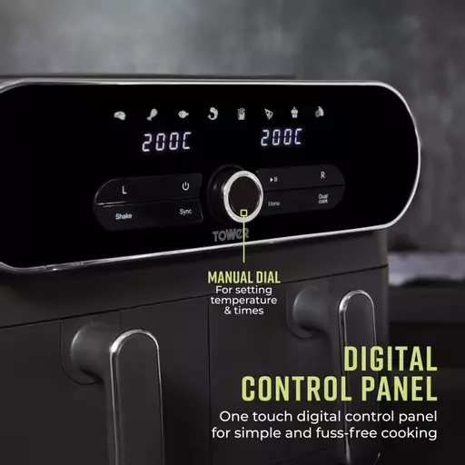 Filter between cooking presets, Dual cook & Sync Functions with the easy to use, one touch digital control panel for simple and fuss-free cooking. The temperature and cooking times can be set using the manual dial.