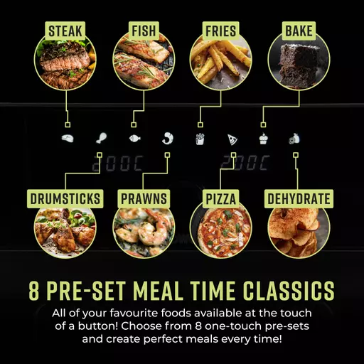 All of your favourite foods available at the touch of a button! Â Choose from 8 one-touch pre-sets to take the guess work out of cooking including Steak, Drumsticks, Fish, Prawns, Fries, Pizza, Cake, Dehydrate