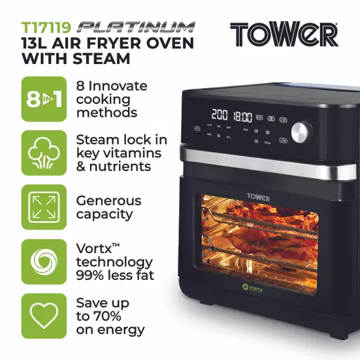 Tower’s unique Steam Air Fryer allows you to air fry, whilst simultaneously steaming your food. Air fry crispy, delicious healthy meals and harness the power of steam cooking, locking in nutrients, for more flavoursome and healthier meals. The removable 770ml water tank is easy to refill and offers 100 minutes of continuous steam. All of the cooking functions are available at the touch of a button! The large Vizion viewing window lets you monitor cooking progress without opening the door, saving time and energy. Choose from Airfry, Bake, Roast, Grill, Steam, Combo Cook and Reheat to create perfect meals every time! Steam, Combo Cook and Steam Bake options ensure you can create delicious, flavoursome meals with ease. A convenient self-cleaning function utilises the natural power of steam to clean the air fryer, so you don’t have to.  No more burnt on food stains or need to scrub the Air Fryer clean, the self-cleaning function does it all for you at the touch of a button. Become a star baker creating cakes, tarts or pies with the bake function or grill juicy steaks like a pro with the crisper grill plateÂ