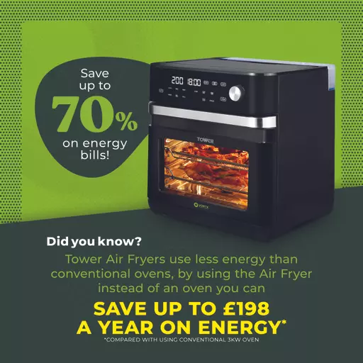 Tower Air Fryers are powerful and cook food up to 30% faster than conventional ovens, yet they also use far less energy.  Save up to 70% on your energy by simply switching to Tower Air Fryer cooking, which could reduce your energy bills by £198 per year