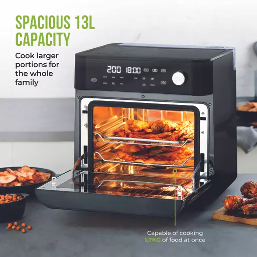 Create small or family sized portions with a 13L capacity capable of cooking over 1.7kg of food at once. The air fryer is compact so doesn’t take up much kitchen work surface space & the 13L basket is larger than most and perfect feeding large families of up to 10 as well as batch cooking for the entire week