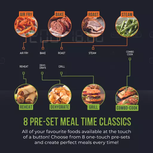 Its digital control panel presents a selection of pre-set menus to cook your favourite food at the touch of a button. Use the 60 minute timer to schedule mealtimes at your convenience or the 24hr timer if using the dehydrator function.