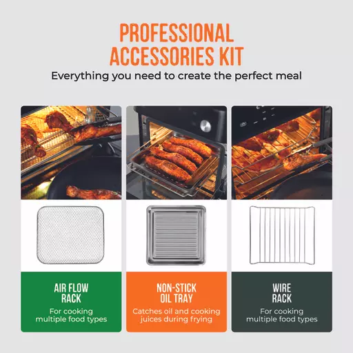 | Anti slip feet. Overheat protection. 200 degree temp. 60 Minute Timer | Includes: Oil Drip Tray. Wire Rack. Wire Baking Pan |