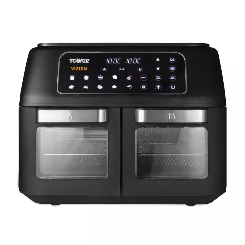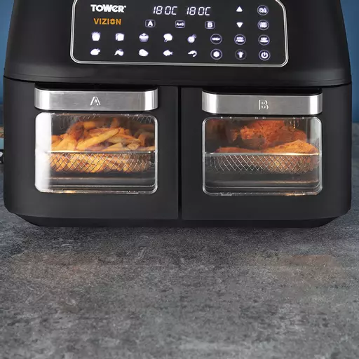Family cooking is made faster, healthier and easier than ever with the Vortx Vizion Dual Compartment Air Fryer Oven from Tower. It has two large viewing windows to save time and energy in the kitchen, allowing you to check if dinner is ready without opening the drawer. With two 5.5L drawers, you can cook multiple items at once, for different timeframes and even at alternate temperatures Thanks to the smart finish function, the fuss is taken out of cooking as both drawers can be programmed to finish at the same time. Using its rapid circulation technology, your favourite food will be ready in less time without any compromise to taste, cooking deliciously-crisp and flavoursome fries in just 15 minutes.