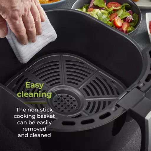 Uses Tower’s rapid air circulation technology to cook your food 30% faster with 99% less oil and uncompromised fried taste – you lose the fat, not the flavour